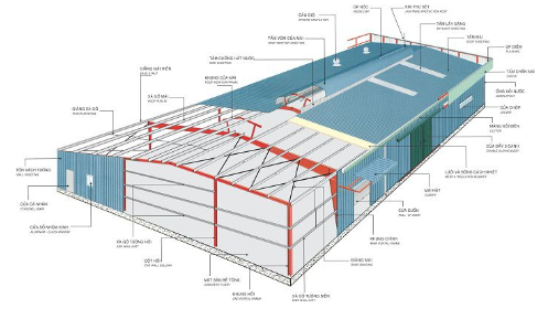 - Khung kèo và xà gỗ: Cột và kèo khung thép được thiết kế để tối ưu kết cấu. Thông thường sẽ sử dụng cấu kiện thép tổ hợp để hàn thành kết cấu dạng chữ I. Những nhà xưởng nhỏ có thể dùng thép hình thay vì thép tổ hợp.