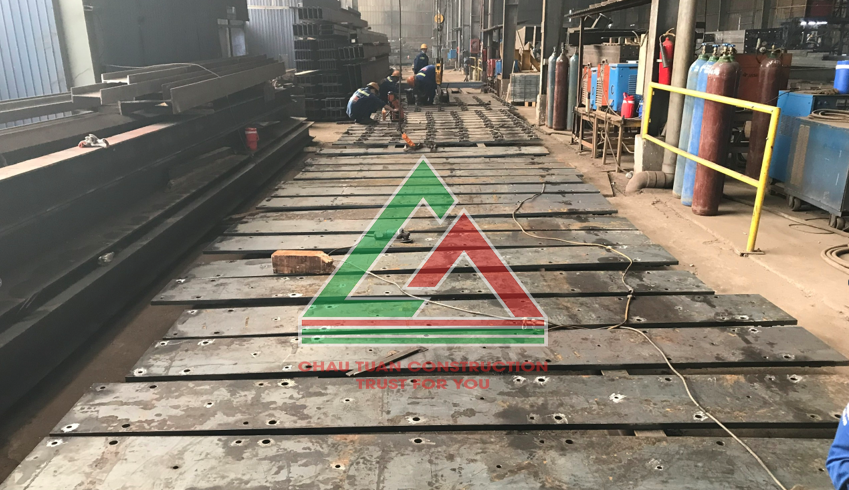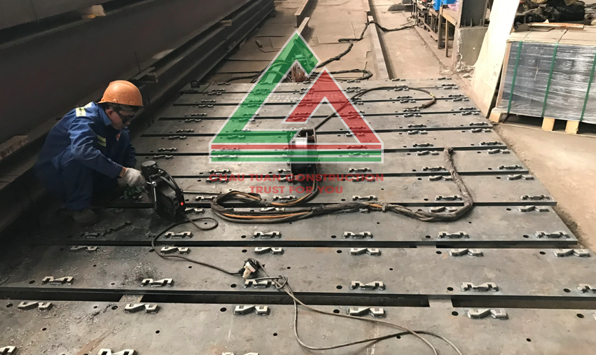 Quy trình gia công tấm thép đệm bao gồm các bước như là: cắt thép, định hình cấu kiện, hàn cấu kiện, phun bi, phun sơn, vệ sinh bề mặt....Mỗi bước cần thực hiện thật tỉ mỉ và chuẩn theo kích thước bản vẽ yêu cầu, hạn chế các sai lệch ảnh hưởng đến việc lắp đặt sau này.